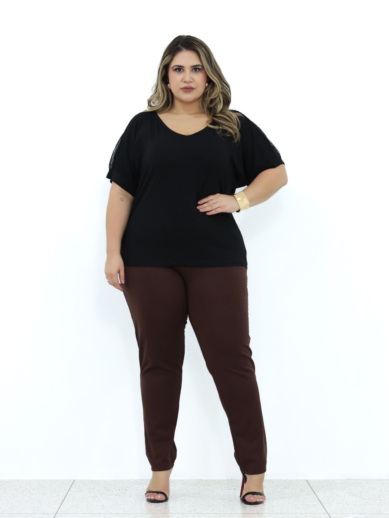 Blusa Básica Decote V Sofia é uma peça essencial e versátil para o guarda-roupa plus size. Confeccionada em malha leve e confortável, como viscolycra ou suplex, ela oferece um caimento soltinho e fresco. O design minimalista apresenta um clássico decote em V e mangas curtas estilo “folha” ou morcego, que proporcionam elegância e discrição. Ideal para o dia a dia, é a base perfeita para inúmeras combinações de looks.