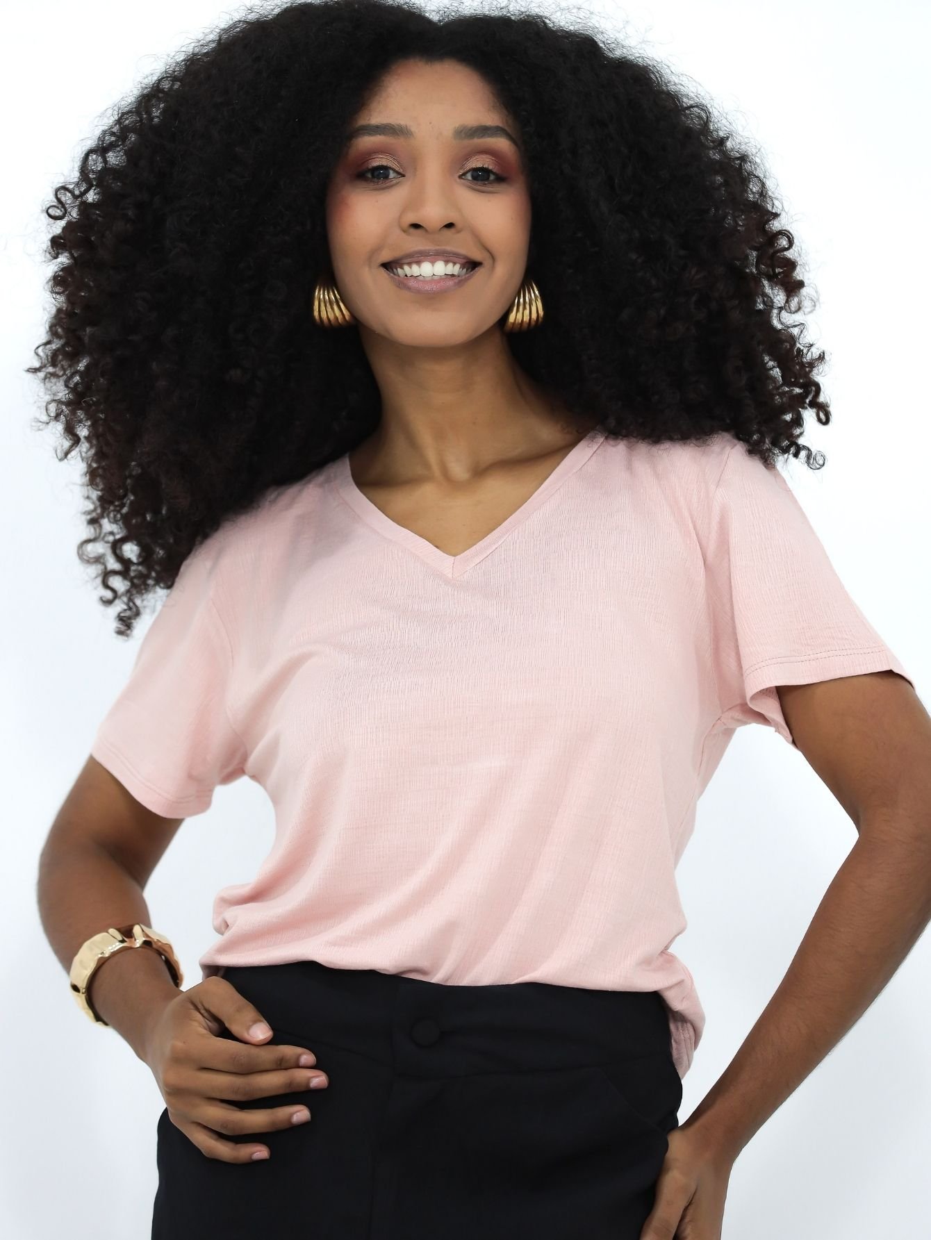 Descubra o equilíbrio perfeito entre conforto e estilo! Esta blusa de manga curta em tom rosa suave é a peça coringa que faltava no seu guarda-roupa.