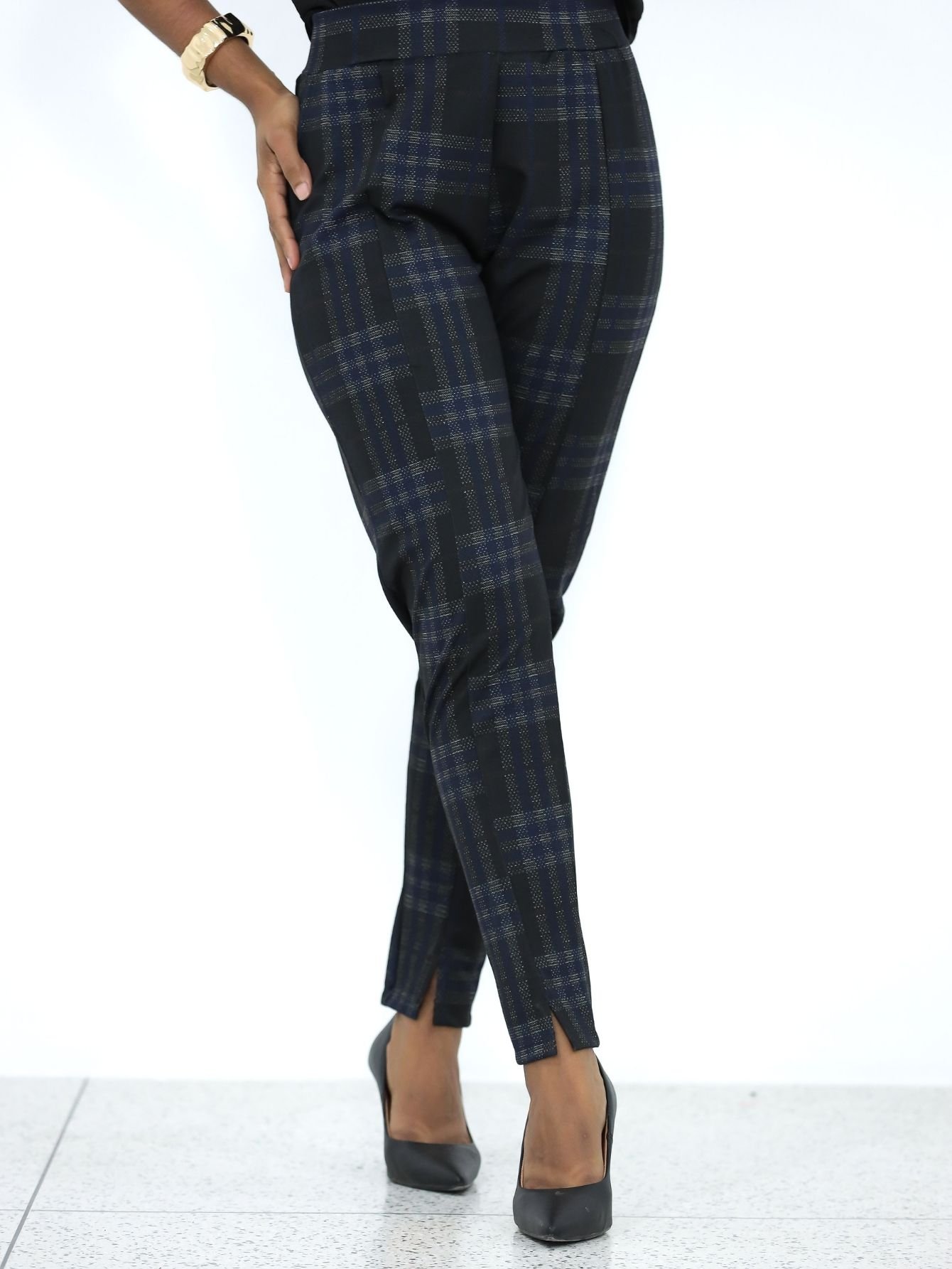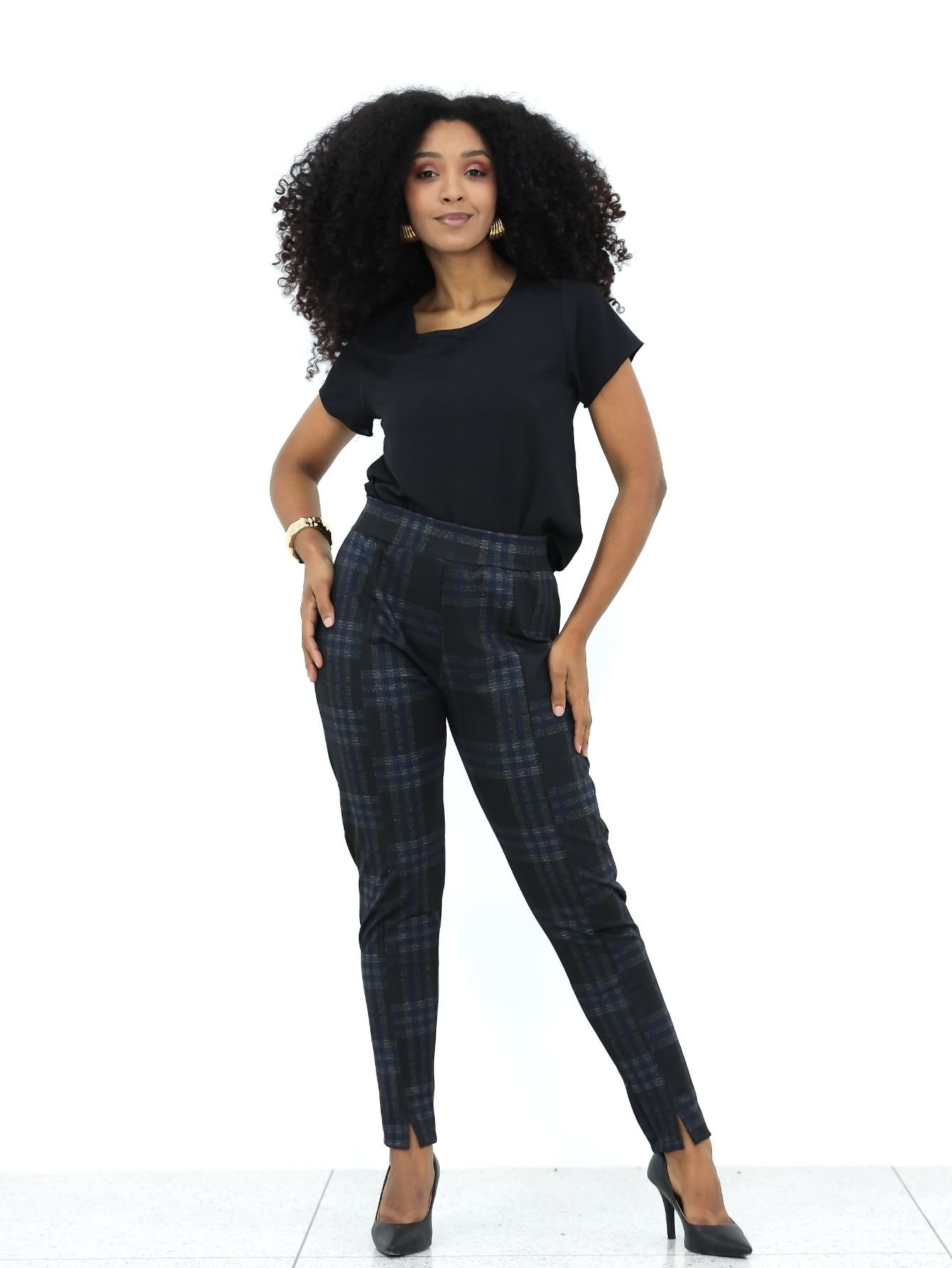 A Calça Alfaiataria Xadrez Kelsey é a peça chave para um visual sofisticado e atemporal. Confeccionada em tecido encorpado e com alta elasticidade (composição usual de poliéster e elastano), ela garante conforto e um caimento impecável que valoriza a silhueta. A modelagem ajustada, estilo skinny ou cigarrete, apresenta uma charmosa fenda discreta na barra, adicionando um toque de modernidade ao clássico padrão Príncipe de Gales em tons de preto, cinza e azul.