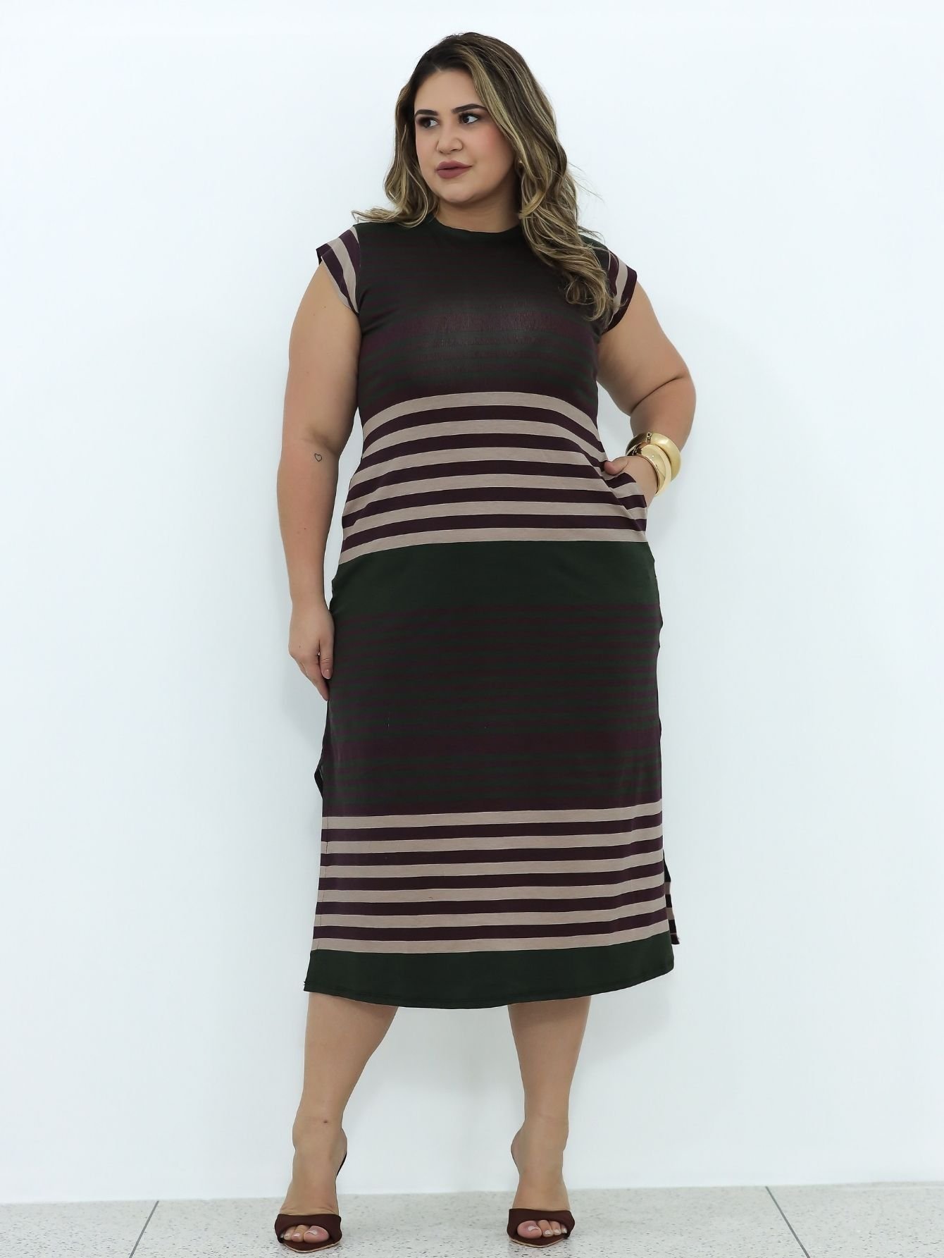 Vestido Midi Listrado Aura é uma peça versátil e atemporal que combina elegância e conforto. Confeccionado em malha de viscose com elastano, o vestido é leve, tem um toque macio e excelente caimento que valoriza a silhueta. A modelagem midi, com comprimento abaixo do joelho, apresenta estampa de listras horizontais em tons terrosos de marrom, bege e um toque de verde militar na barra, além de discretas fendas laterais. Possui decote redondo e mangas curtas, sendo perfeito para diversas ocasiões, do dia a dia a eventos casuais.
